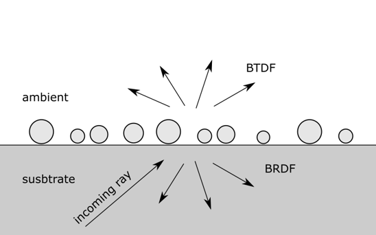 Raue oder mit Partikeln kontaminierte Oberflächen oder Grenzflächen streuen Licht, das auf sie fällt und werden dadurch selbst zu einer Lichtquelle, einem Fremdleuchter. Die Strahldichte dieser Lichtquelle, bezogen auf die Bestrahlungsstärke des einfallenden Lichts heißt BSDF (bi-directional scattering distribution function) und beschreibt die Streueigenschaften der Fläche, mit Ausnahme der Polarisation des Streulichts, vollständig. Je nachdem, ob man sich für das diffus transmittierte oder reflektierte Licht interessiert, spricht man auch von der BTDF (bi-directional transmittance distribution function) oder BRDF (bi-directional reflectance distribution function).
