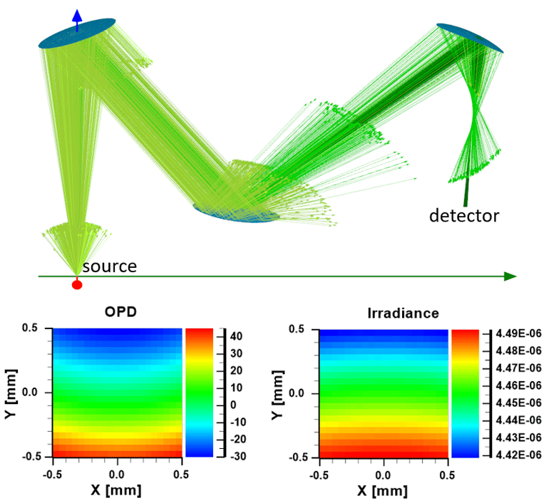 The picture shows a ray trace through the system along with the irradiance distribution and optical path length map on the detector.